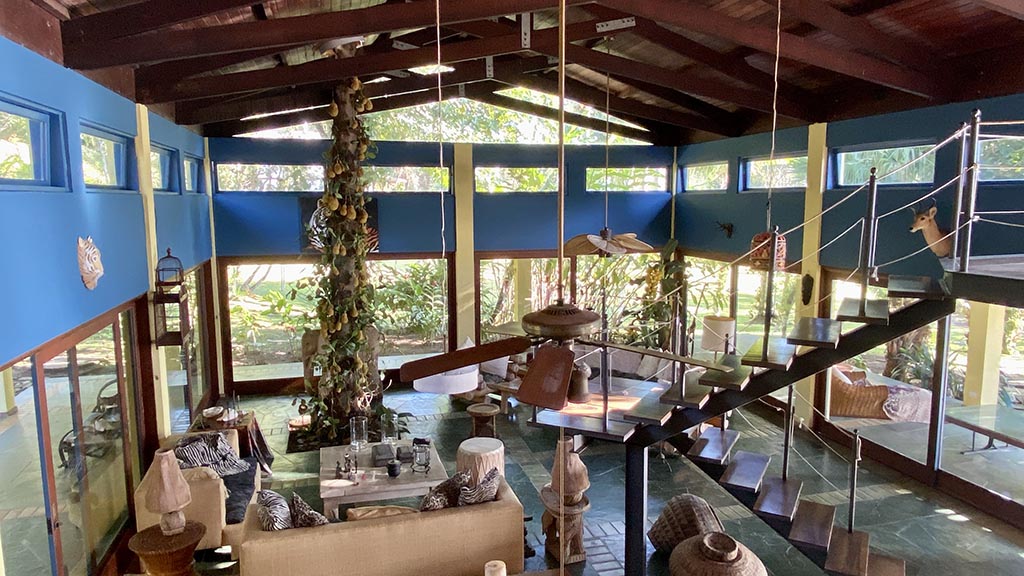 La casa principal cuenta con dos salones muy amplios y un árbol de yaca en el medio de la sala que se conservó para integrar la naturaleza al entorno. Todo con vistas a los jardines y al mar gracias a los ventanales panorámicos que rodean la casa.